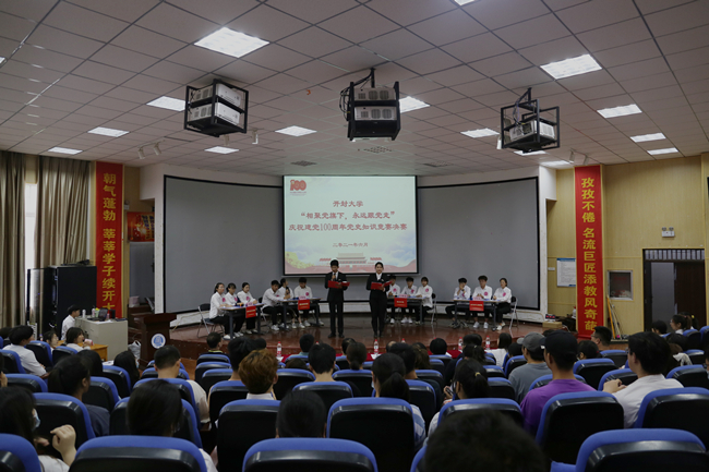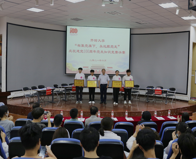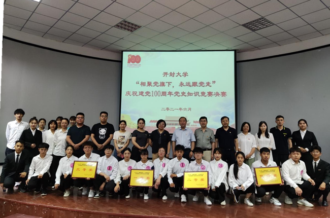 本站訊 為慶祝中國共產黨成立100周年,深入貫徹習近平總書記在黨史學習教育動員大會上的講話精神,6月17日,由校黨委組織統戰部主辦、旅游學院黨總支承辦的“相聚黨旗下,永遠跟黨走”開封大學慶祝建黨100周年黨史知識競賽決賽在國際教育學院一樓報告廳舉行。校黨委副書記儲建新,校黨委委員、組織統戰部部長趙海勝、旅游學院黨總支書記尤影、后勤管理服務中心主任徐紀珂、后勤管理服務中心黨支部書記田路春以及各院部師生代表出席活動。