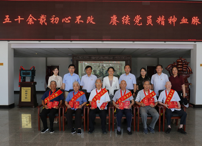 黨委書記陳燦為參加儀式的6名黨齡50年以上的老黨員代表逐一頒發佩戴紀念章、綬帶和賀卡,并帶領現場全體黨員,面向鮮紅的黨旗,重溫了入黨誓詞,進一步堅定初心使命,汲取奮進力量。學校領導將通過走訪慰問為其他7名黨齡50年以上的老黨員頒發紀念章、綬帶和賀卡。