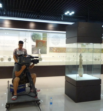 劇組編導張馨尹針對宋金時期的民俗文化、娛樂風俗等方面的問題對藝術設計學院魏躍進教授進行了采訪。魏躍進教授指出,大觀博物館館藏的宋代陶模是宋代藝術生活性的完美體現,它印證并真實地反映了宋代民俗和娛樂風尚,是研究宋代歷史、文化、藝術、民俗的重要資料。攝制組工作人員隨后對宋代陶模、陶瓷和玩具等館藏文物進行了一一細致的了解并選取重點進行拍攝。