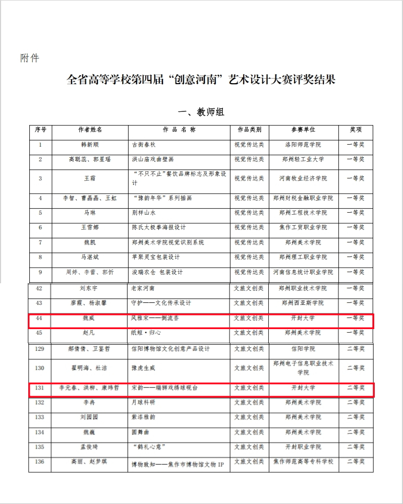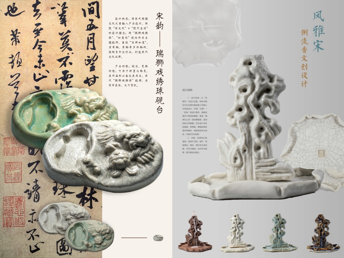 近日,由河南省教育廳主辦,鄭州美術學院和黃河科技學院承辦的第四屆“創意河南”藝術設計大賽圓滿圓滿落幕。我校大觀博物館選送的文旅文創設計作品《風雅宋——倒流香》榮獲一等獎,作品《宋韻——瑞獅戲繡球硯臺》榮獲二等獎。