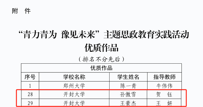 本站訊 近日,中共河南省委教育工委、河南省教育廳公布“青力青為豫見未來”主題思政教育實踐活動優質作品獲獎名單,由我校信息工程學院教師賀鈺指導、孫傲雪同學創作的作品,以及藝術設計學院王妍教師指導、王豪杰創作的作品從全省35.3萬件參賽作品中脫穎而出,雙雙入選35項省級優質作品,彰顯了學校思政教育與專業實踐深度融合的育人成效。