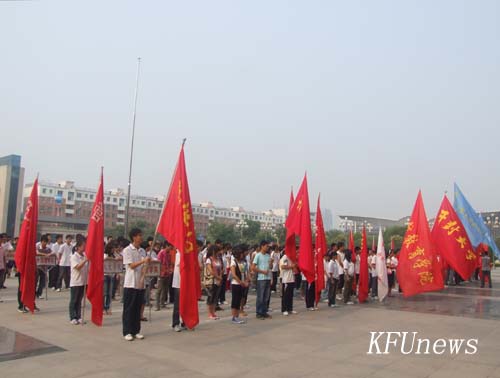 本站訊 6月26日上午,共青團開封市委組織的2010年開封市大中學生志愿者暑期社會實踐活動啟動儀式在我校明德廣場舉行。我校校長拜五四,黨委副書記、副校長儲建新出席了啟動儀式,儲書記代表學校在啟動儀式上致詞。開封大學、黃河水院等全市近10所大中專院校參加啟動儀式,啟動儀式結(jié)束后,參與活動的志愿者小分隊立即行動起來,冒著酷暑奔赴各自實踐基地,拉開了我市大中學生志愿者暑期社會實踐活動的序幕。我校團委組織的13個青年志愿者小分隊參加本次暑期社會實踐活動。