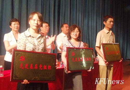 會上,黨委副書記、副校長儲建新記宣讀了《關于表彰2009年度先進基層黨組織、優秀共產黨員、優秀黨務工作者的決定》、《關于表彰深入學習實踐科學發展觀活動“四比三爭”先進個人的決定》和《關于對2009年“最佳黨日活動”進行表彰的決定》。與會領導為獲獎的先進集體和優秀個人頒發了榮譽獎牌、榮譽證書。紀委書記、工會主席范金梅宣讀了2010年度新發展黨員名單,新黨員代表在黨旗下進行了莊嚴的宣誓;人文學院學生丁璐代表新黨員發言,向黨組織表達了心愿和決心。