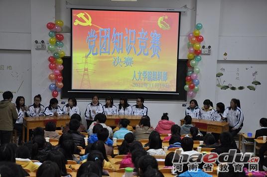 為進一步學習貫徹宣傳黨的“十八大”精神,不斷提高大學生黨團知識素養(yǎng),進一步促進大學生緊跟黨走的步伐。開封大學人文學院于11月19日晚舉辦了以“學習黨團知識,弘揚民族文化”為主題的黨團知識競賽。