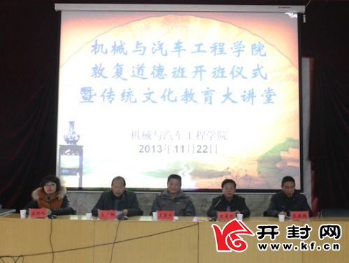開(kāi)封網(wǎng)訊 記者董凌報(bào)道 11月22日,開(kāi)封大學(xué)機(jī)械與汽車(chē)工程學(xué)院在該校晉安路校區(qū)報(bào)告廳舉行“敦復(fù)道德班開(kāi)班儀式暨傳統(tǒng)文化教育大講堂活動(dòng)”。開(kāi)封市敦復(fù)書(shū)院院長(zhǎng)王英杰、開(kāi)封大學(xué)副校長(zhǎng)萬(wàn)是明等領(lǐng)導(dǎo)出席開(kāi)班儀式,該院近500名師生參加了本次活動(dòng)。