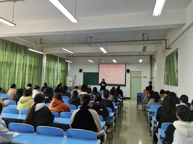 本站訊 為慶祝第113個三八國際婦女節,3月2日下午在17號樓303教室,校工會與外國語學院黨總支、分工會聯合舉辦的“巾幗心向黨 奮進新征程”慶“三八”黨的二十大精神宣講報告會,邀請開封市黨的二十大精神宣講團成員、學校馬克思主義學院教師蘇會君副教授作專題報告。校工會相關人員、外國語學院分工會全體女教工及30名女生代表到場聆聽報告,報告會由外國語學院黨總支書記孟祥茹主持。