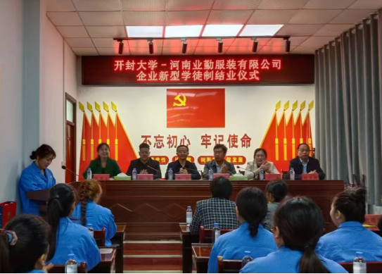 10月30日,開封大學河南業勤服裝有限公司企業新型學徒制項目結業儀式在河南業勤服裝有限公司舉行,副校長李治、教務處、藝術設計學院、開封市人社局相關領導參加結業儀式。